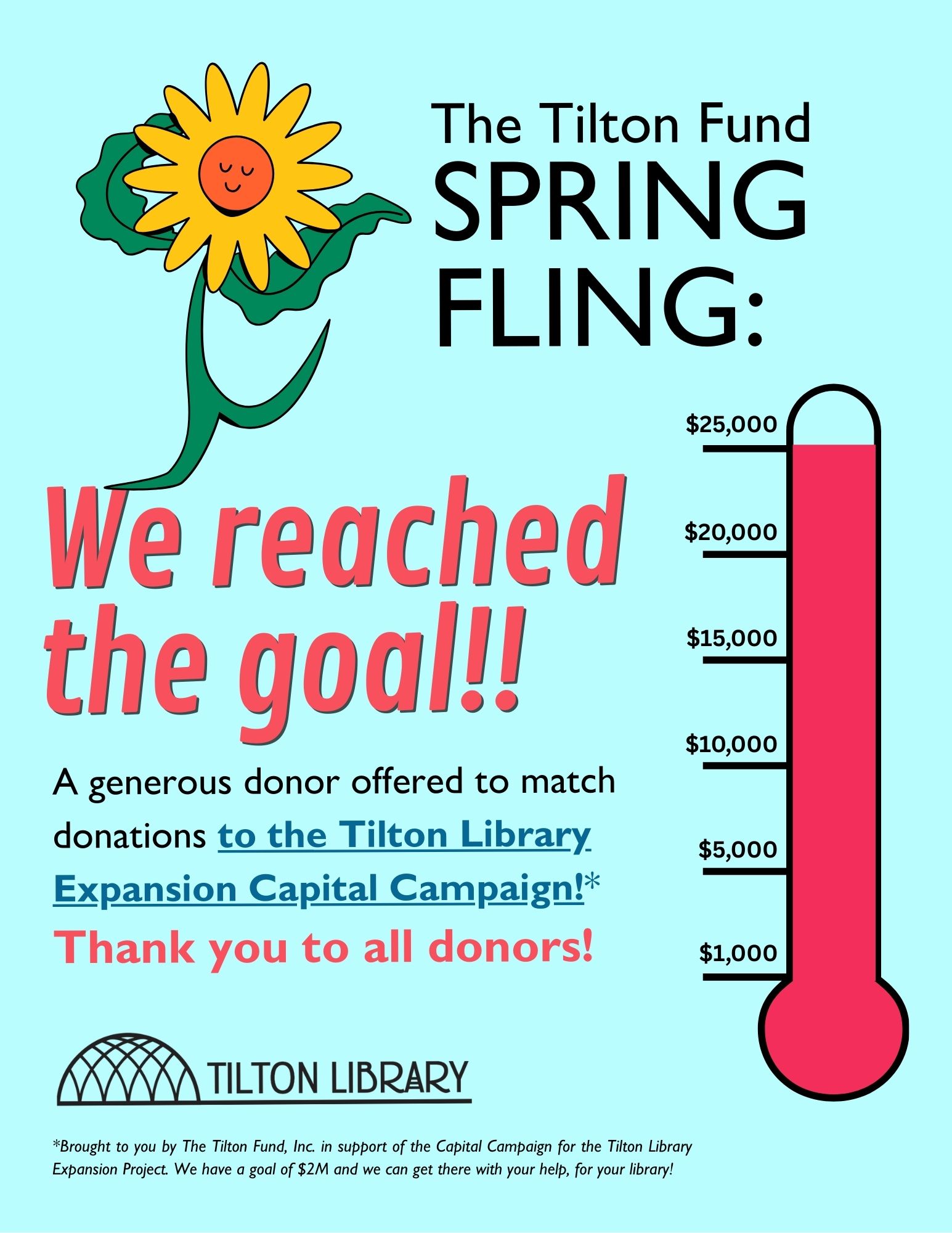 A kind and generous donor offered to match donations up to $25K to the Tilton Library Expansion Capital Campaign!* This goal was reached – thank you to all donors! You will the see the larger fundraising goal ($2M) and how we are reaching that on the Capital Campaign page.