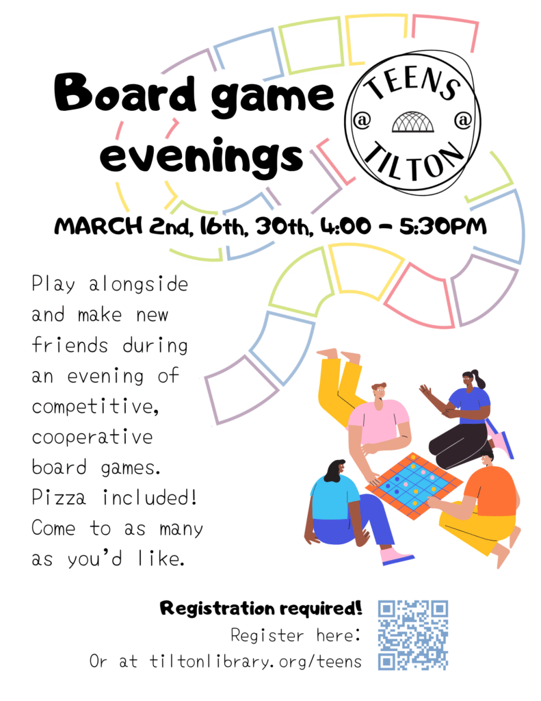 Play a series of collaborative, competitive games; play with current friends and meet new friends! Pizza and hot cocoa provided. Game selection will change for each date. Registration required at https://forms.gle/isQqu3ccBfstAGCP8 . Come to one or all. Ages 11-18